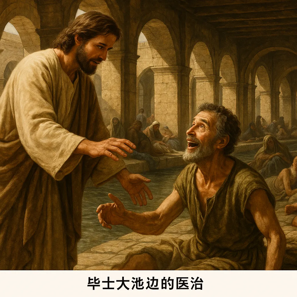 2. 毕士大池的医治传统象征着律法——它能提供医治,但条件苛刻,只有少数人能受益。甚至让我这样说,这些“受益”的人呐,你们的心在哪里 ?!你们的邻舍,这位38年被疾病所捆绑的人,你们在意了吗?!相比之下,耶稣带来的医治是普遍的、无条件的恩典。