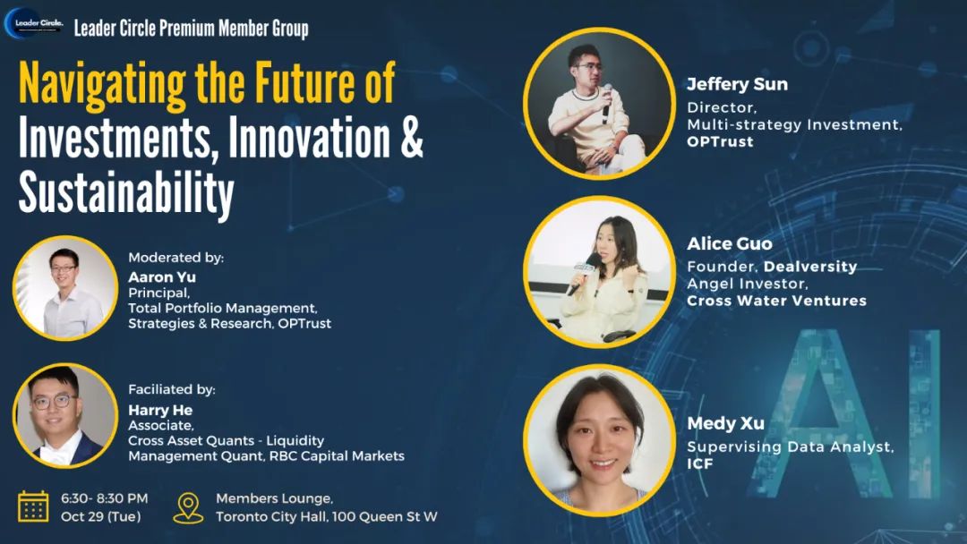Aaron Yu (OPTrust): Principal, Total Portfolio Management, Strategies & Research. Expert in systematic investment and data science professional Jeffery Sun (OPTrust): Director, Multi-strategy Investment. Specialist in multi-strategy investments and technology innovation Alice Guo: Founder, seasoned investor and entrepreneur in venture capital, real estate, and fintech Medy Xu (ICF): Data analytics professional focusing on environmental and public policy