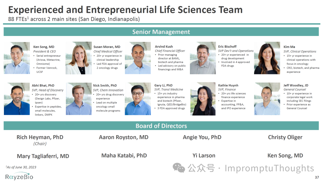 到后面能迅速把公司搭建的这么好,可见优秀的人才学习能力都是非常强的,可以迅速掌握到一个新行业的要领,而成熟管理者的执行能力也是可以应用在不同领域的。RayzeBio 也是裹着锦绣的襁褓出生,从成立之初就是顶配,Ken 的加入更是让公司如虎添翼。一路集结了最好的团队和投资人: