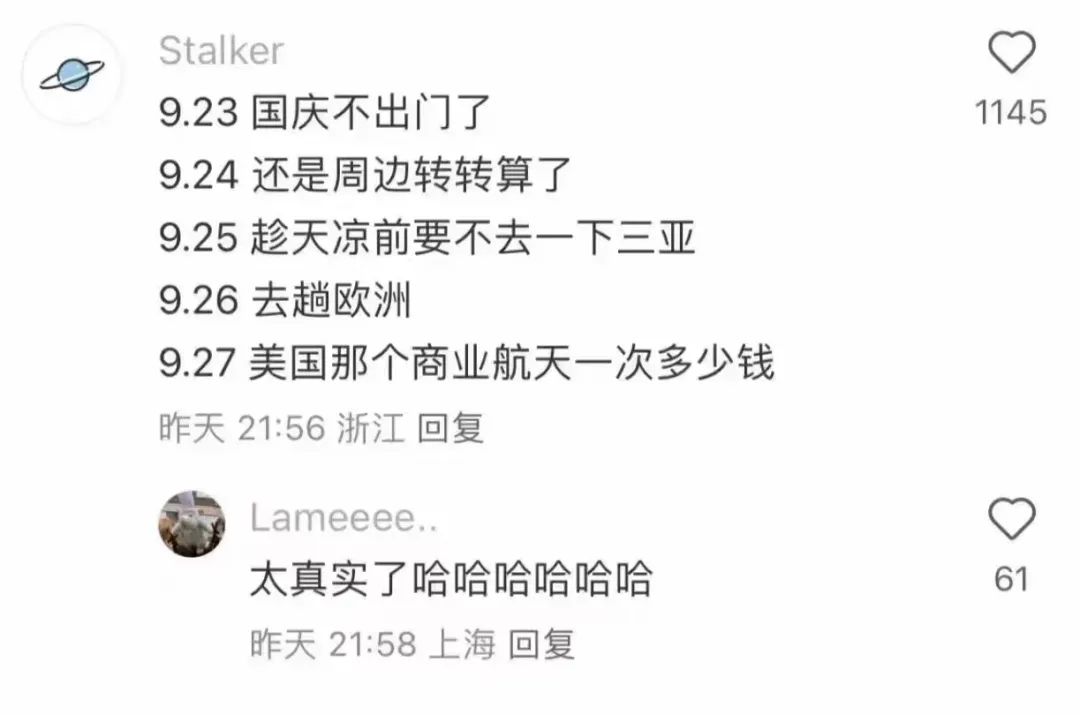 国庆本想出跑滴滴的,现在已经想欧洲游了,个别极端分子甚至想去美国做载人上天的大火箭。