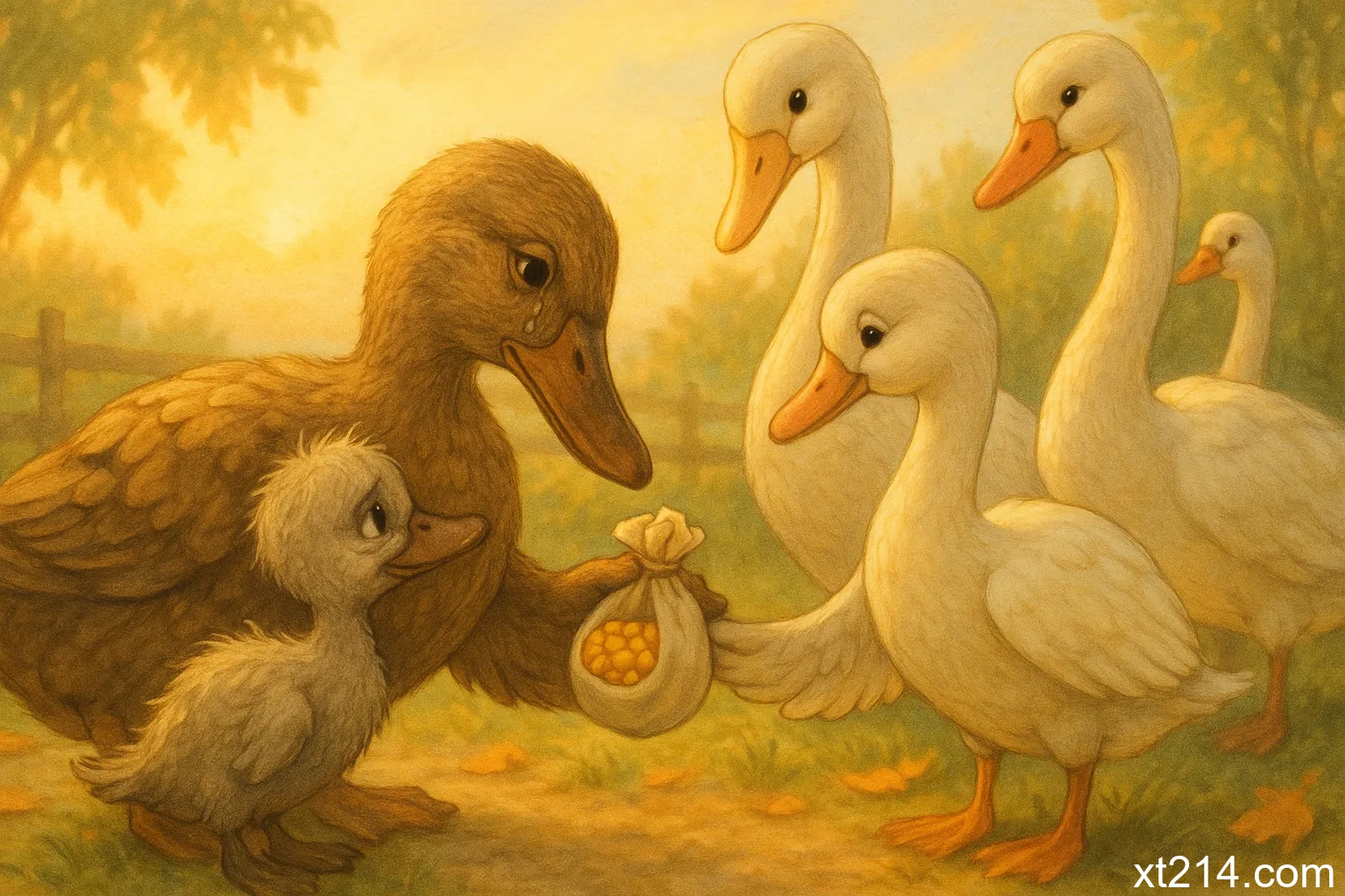走出鸭棚时,丑丑看到了花脸、长嘴和胖胖三人组。出乎意料的是,他们没有嘲笑他,而是安静地站在一旁,眼神复杂。