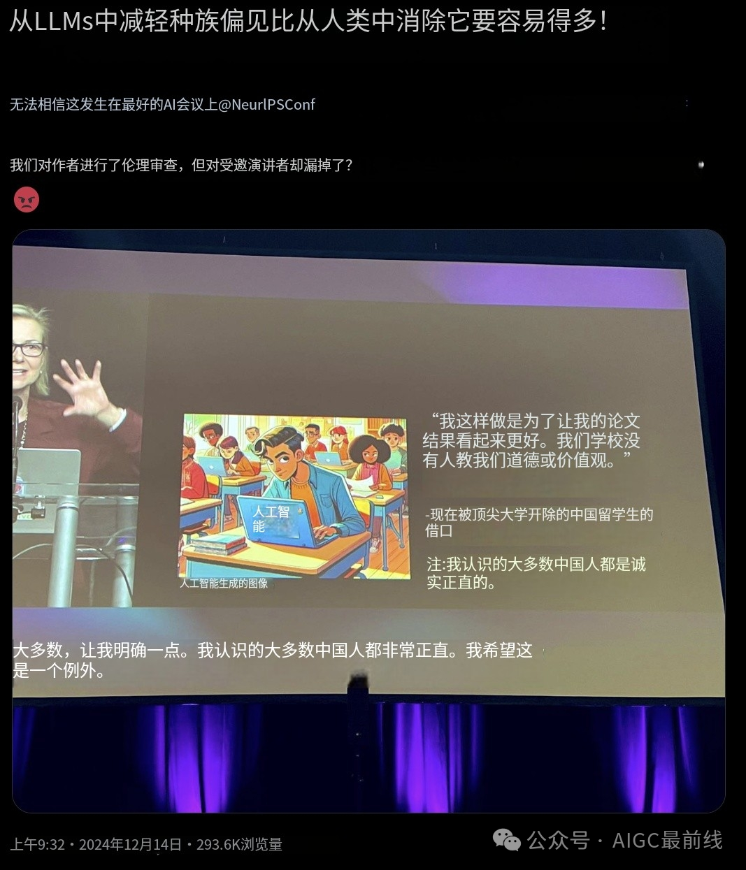这两天,机器学习顶会NeurIPS正在加拿大温哥华如火如荼的进行。然而一段小插曲却引起了华人学者的注意,起因是大会邀请的Keynote报告人Rosalind Picard在一张幻灯片里举了一个例子,疑似有种族歧视的论断。更有甚者,在会后问答环节,一名观众就这张幻灯片问了一个问题,而Rosalind Picard虽然极力掩饰自己对华人学者的尊重,但还是被人指出其骨子里的种族歧视。要知道,Rosalind Picard可是大名鼎鼎的情感计算学者,其工作被认为是开创了情感计算这个领域,被称为“情感计算之母”,可是这次翻车事件,却着实刺痛了其追随者,特别是华人学者的感情,小编表示很愤怒!