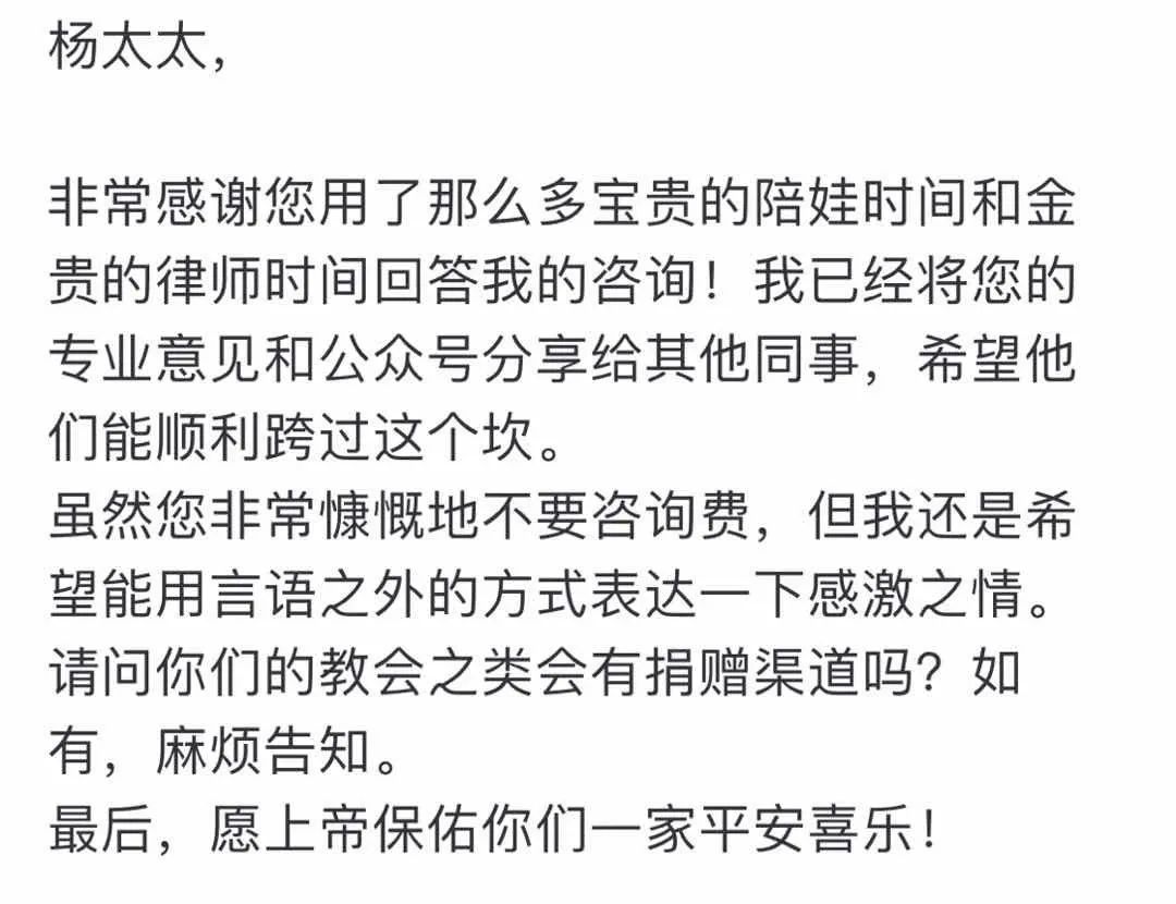 我执业这么多年,对于个人客户的咨询,通常是不收费的。我印象中收过个人客户律师费的只有一个,因为在两次电话后,那个客户提出要增加十几个小时的咨询。除此以外,其他来电来信来访的,不管电话是半小时,还是见面要一小时,甚至咨询完了再来再来电话,我都没有收过一分钱。随手贴个姐妹的邮件(当然我到最后也没有收她钱):