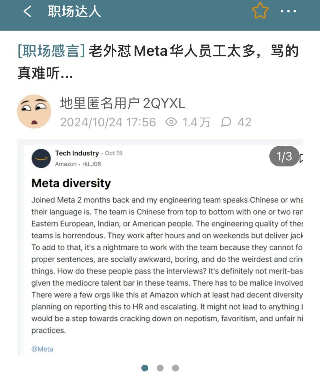 原来是美国一个职场论坛Blind上,有人发帖讨论Meta的多元化问题,而这里的矛头就一下指向了华人工程师。