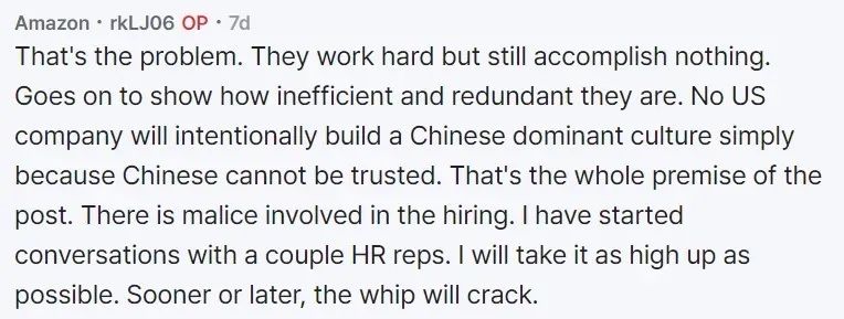 这就是问题所在。他们工作很努力,但依然一事无成。这充分说明了他们有多低效、多余。没有美国公司会故意建立以中国人为主的文化,因为中国人不值得信任。这正是这篇帖子想表达的核心观点。