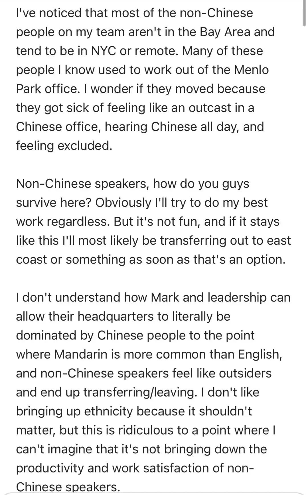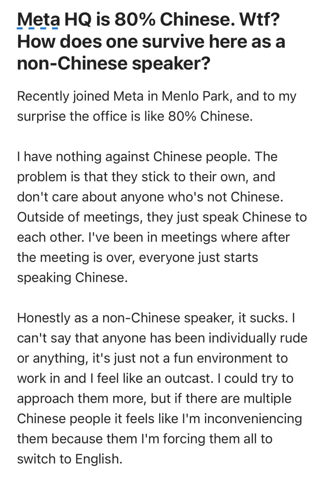 我不理解扎克伯格和公司领导层是怎么允许总部完全由中国人主导,导致中文比英文更常用,不会中文的人因此感到被排斥,最终转岗或离职。我不喜欢提到种族,因为这不该成为问题,但这种情况已经荒谬到影响工作效率和非中文员工的工作满意度了。
