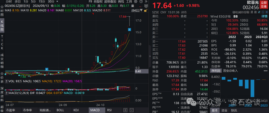 9月24日一来,欧菲光在市场情绪全面回暖和为华为mate70供货的憧憬下,被游资盯上而一路走高,截至今日,股价从8.25元一路涨至17.64元,涨幅114%,市值高达584亿元。