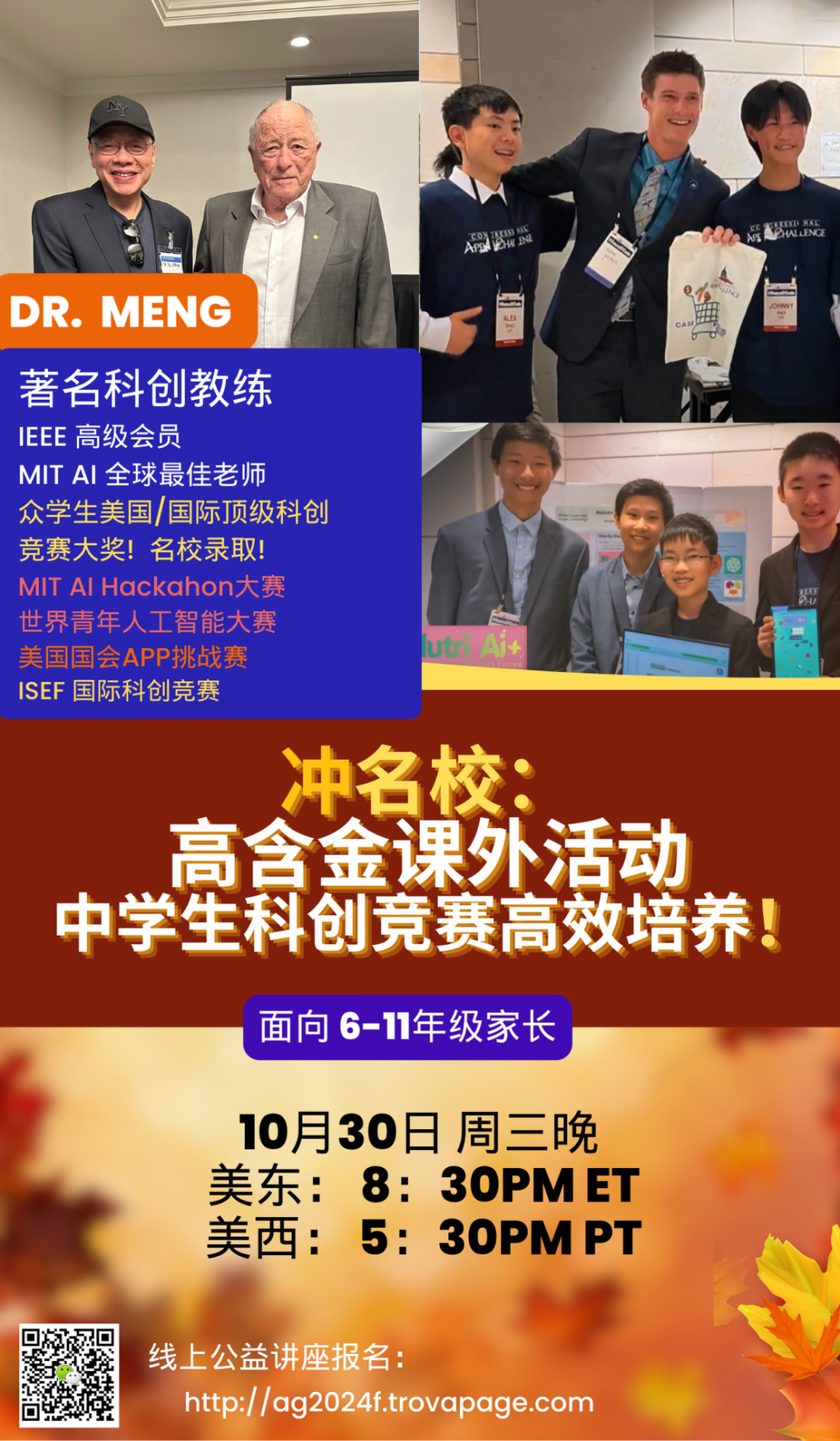 有这么一位老师,打破了普通家庭学生参与活动的限制,把许多“普娃”送进了常春藤名校,他就是著名科创教练IEEE高级会员、MIT AI全球年度最佳教师Dr. Meng,他帮助学生打造极具竞争力——科创活动和竞赛,成为学生脱颖而出的关键。通过这些活动,学生不仅能够发展创新思维,还能展示出色的学术与科研能力,为未来申请顶尖高校铺平道路。