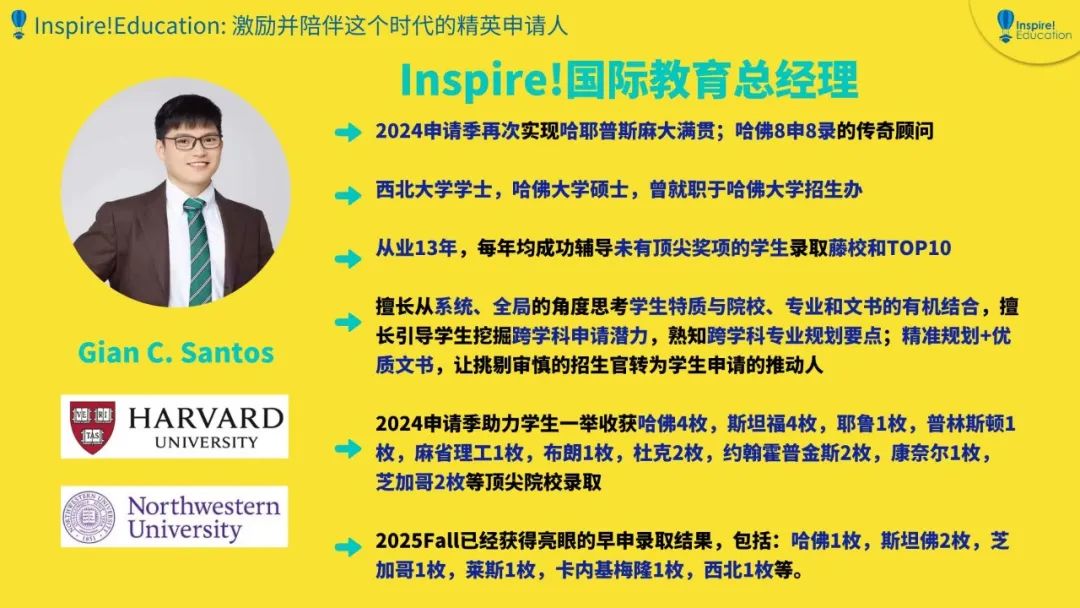 过去两周里,“爸爸真棒”后台一直收到家长的留言,可以说是隔着屏幕都能感受到焦虑。于是,我在第一时间找到了“爸爸真棒”的老朋友,创下哈佛8申8录奇迹,Inspire!国际教育总经理Gian老师,除了13年资深顾问、2024年申请季“哈耶普斯麻大满贯”,25届早申目前已经拿到哈佛、斯坦福2、西北、芝加哥、Wash U、CMU、Rice等傲人战绩之外,Gian老师本身也是一位超级学霸,西北大学学士,哈佛大学硕士,曾就职于哈佛大学招生办公室。