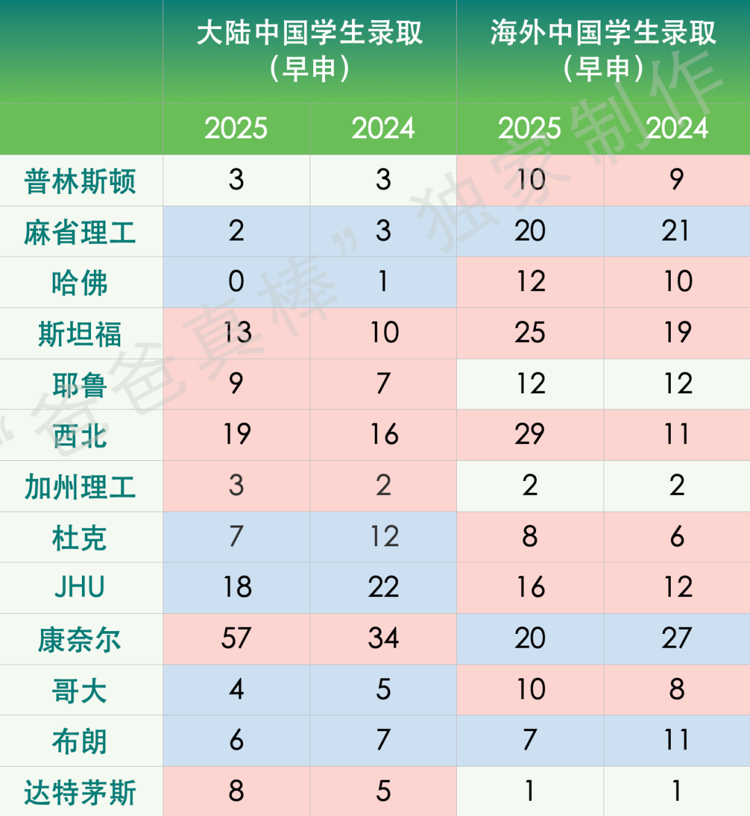 整体来看,排名前5的大学对国内生源更保守,很可能是评估中国学生以及为RD预留名额。