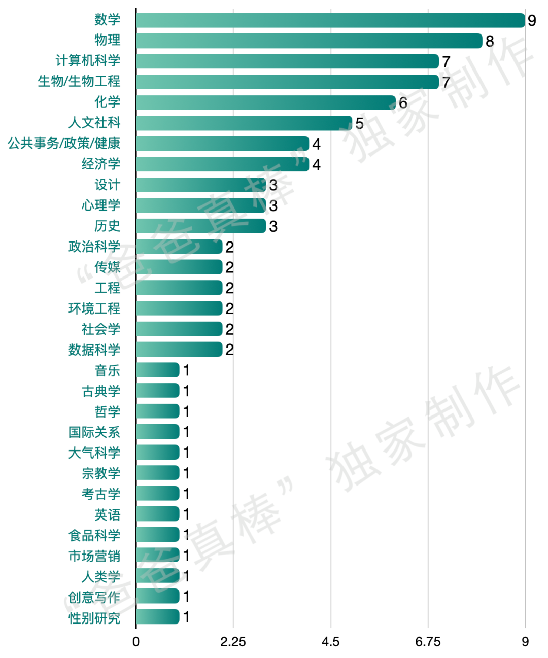 根据目前整体放榜学校部分专业数据,“爸爸真棒”也做了对应统计——其中数学、物理、化学、生物等硬核专业的占比最高,连中国孩子爬藤录取难度最高的计算机科学都有哈“耶普斯麻”级别的录取。