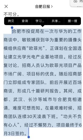 「合肥市投促局在一次与华为的工作商谈中,敏锐捕获到华为重要的摄像头模组供应商“欧菲光”,正谋划在全国选址建立光学光电产业基地项目。经过反复讨论,招商人员认为欧菲光项目产品市场广阔、项目标的优良。随后招商部门立即组成专家团队,前后开展近百场商谈,形成几十篇研判报告。」