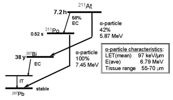 Astatine (211At)作为一种α粒子发射核素,具有7.2小时的物理半衰期,能够通过30 MeV的回旋加速器生产。 [211At]At核素有两种衰变途径:一是通过α衰变途径,约42%的 [211At]At衰变时释放α粒子转变为 [207Bi]Bi,随后[207Bi]Bi通过电子俘获衰变(EC)转变为稳定的[207Pb]Pb;二是通过电子俘获衰变途径,约58%的 [211At]At衰变时通过电子俘获转变为[211Po]Po,在此过程中会产生77-92 keV的X射线,这些X射线可以被常规的伽马探测器探测到,因此可以用来计算[211At]At的活性,并通过平扫和SPECT成像定量 [211At]At在生物体内的分布。[211Po]Po最终通过α衰变转变为稳定的[207Pb]Pb。由于[211Po]Po的半衰期非常短,只有0.516秒,因此它在衰变前扩散的距离有限,这也限制了它从 [211At]At摄取位点处逸出的可能性。