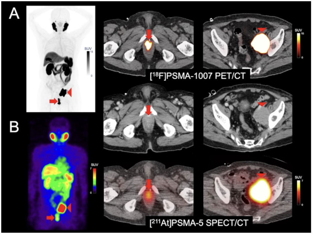 2024年12月17日,Astatine (211At)核药领域迎来了重要的里程碑——首个[211At]PSMA-5人体SPECT/CT成像结果的公布,这一成果标志着Astatine (211At)核药领域取得了突破性进展。国际上使用砹(At-211)进行靶向阿尔法治疗的领军人物之一、大阪大学放射科Tadashi Watabe教授为通讯作者于核医学期刊《European Journal of Nuclear Medicine and Molecular Imaging》发表题为“First-in-human SPECT/CT imaging of [211At]PSMA-5: targeted alpha therapy in a patient with refractory prostate cancer”的论文,这项研究针对转移性去势抵抗性前列腺癌(mCRPC)提出了一种创新的治疗策略,采用[18F]F/[211At]At标记的化合物进行诊断和治疗(theranostic approach),并正式公布了首个[211At]PSMA-5人体SPECT/CT成像结果。