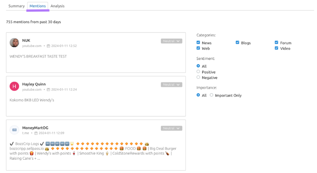 点击“mention”选项卡可查看按日期排序的所有品牌提及情况,并查看用户的情绪。包括中性、积极、消极。