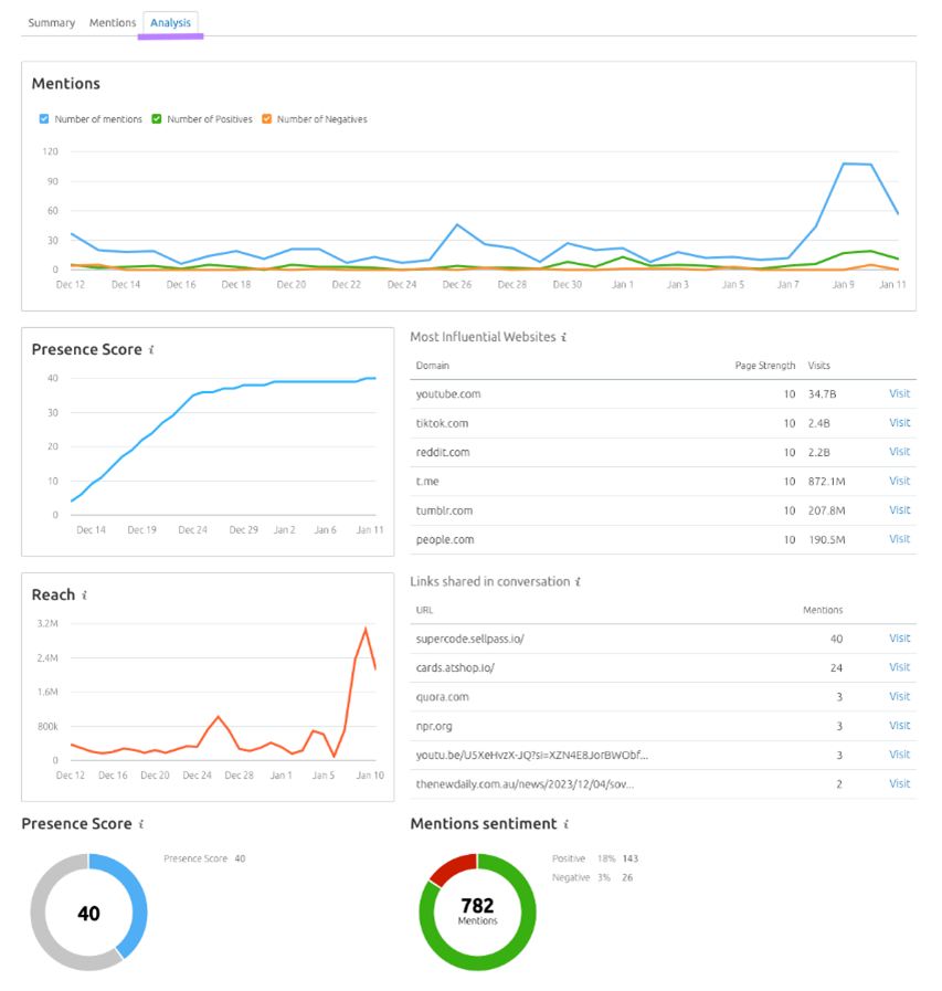 例如,在“Summary”选项卡显示你的品牌的最新的品牌提及。以及按日期列出提及量的图表。如果这个数字在增加,则表明越来越多的人开始意识到你的品牌。
