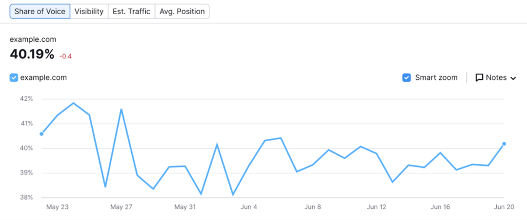 例如,如果你注意到竞争对手3在社交媒体上的 SOV 比你高,那么就集中精力改进你的社交媒体内容策略,以增加你的声音份额。而需要找到您的网站流量的SOV,使用Semrush的排名跟踪功能(Position Tracking)。这样可以帮助您查看自身品牌和竞争对手的SOV。