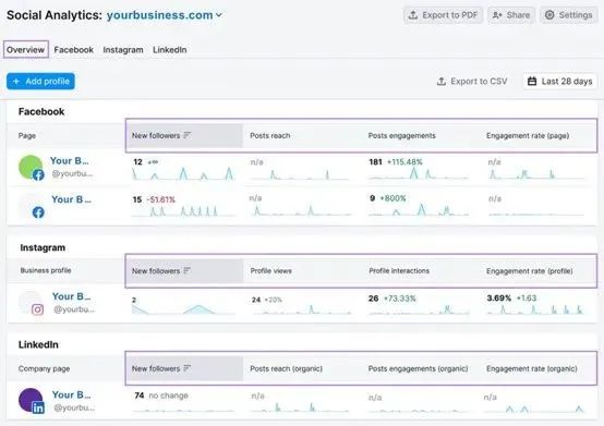 这些指标的增加表明自身品牌在线知名度正在提高。这可能来自付费的社交策划,KOL营销,或社交自然搜索。使用像Semrush的Social Analytics这样的工具来衡量关键的社交媒体指标。包括参与率,粉丝增长,覆盖范围,等等。