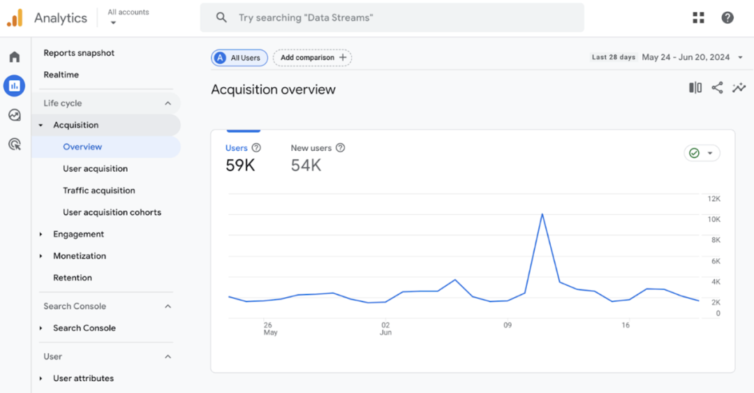 进入GA4,然后打开 “Reports” > “Lifecycle” > “Acquisition” > “Traffic acquisition”。