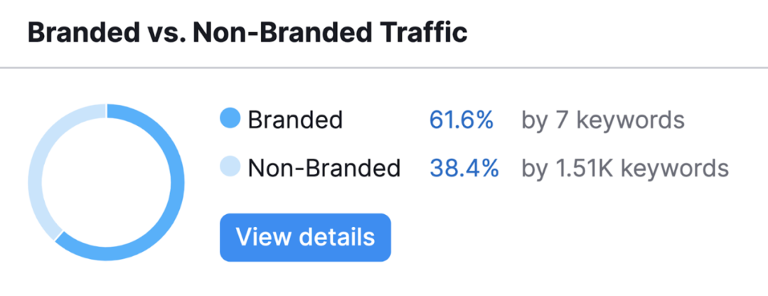关键词数量的增加意味着更多的人可能已经意识到你的品牌和业务。向下滚动到“Branded vs. Non-Branded Traffic”,看看有品牌词和行业词的流量分布。这可以告诉你你在谷歌上搜索的人中有多少品牌知名度。