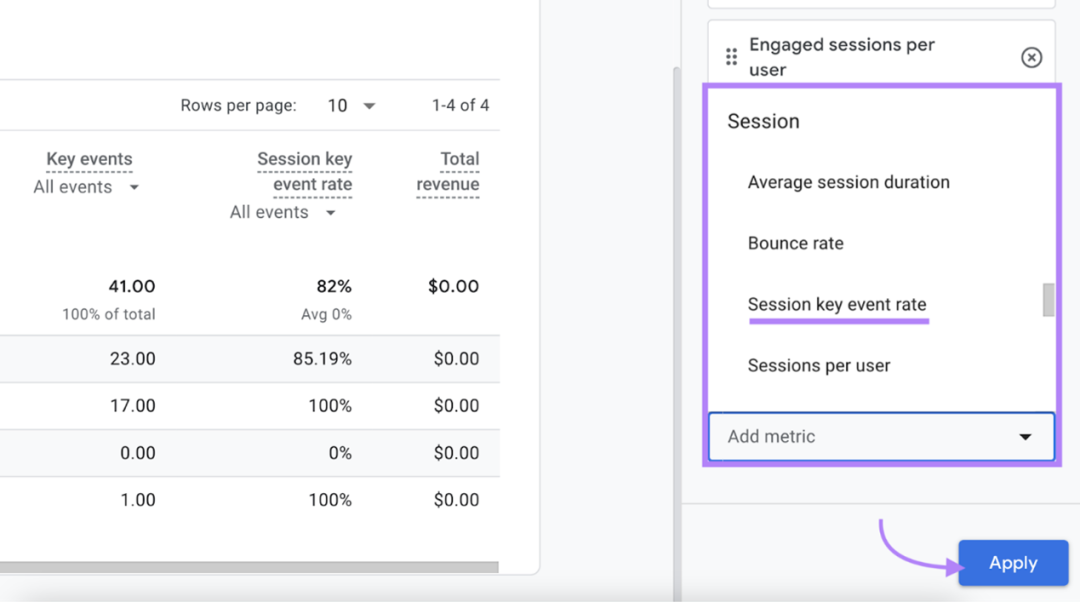 点击“Add metric”,查找“Session key event rate”,然后点击“Apply”。