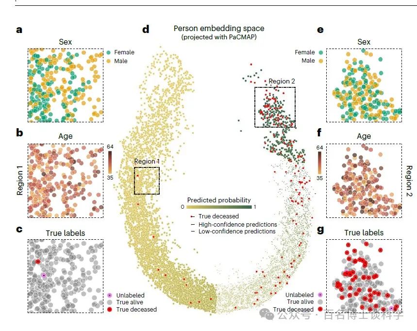 这张图看上去有点复杂,大家不要急,我来帮助你很容易理解。作者把数据集里的海量数据输入AI深度学习模型后,AI得出来一个280维的图形,人类是看不懂的。然后作者使用DensMap方法对280维生命表示进行二维投影,这个二维投影就是上面中间这个马蹄形图样,这样就很容易看懂了。马蹄形的左测最上的土黄色点代表了人群死亡率最低的预测,沿着马蹄形做U字形向右旋转,死亡率逐渐升高,到了右侧最上方的绿色区,死亡率最高。里面的红点是实际死亡人数。可以看到右上方方框里,死亡人数最多。这就是AI对死亡率的预测,精确度相当高。作者还用AI对人的个性特征等进行了预测,这里就不展开了。