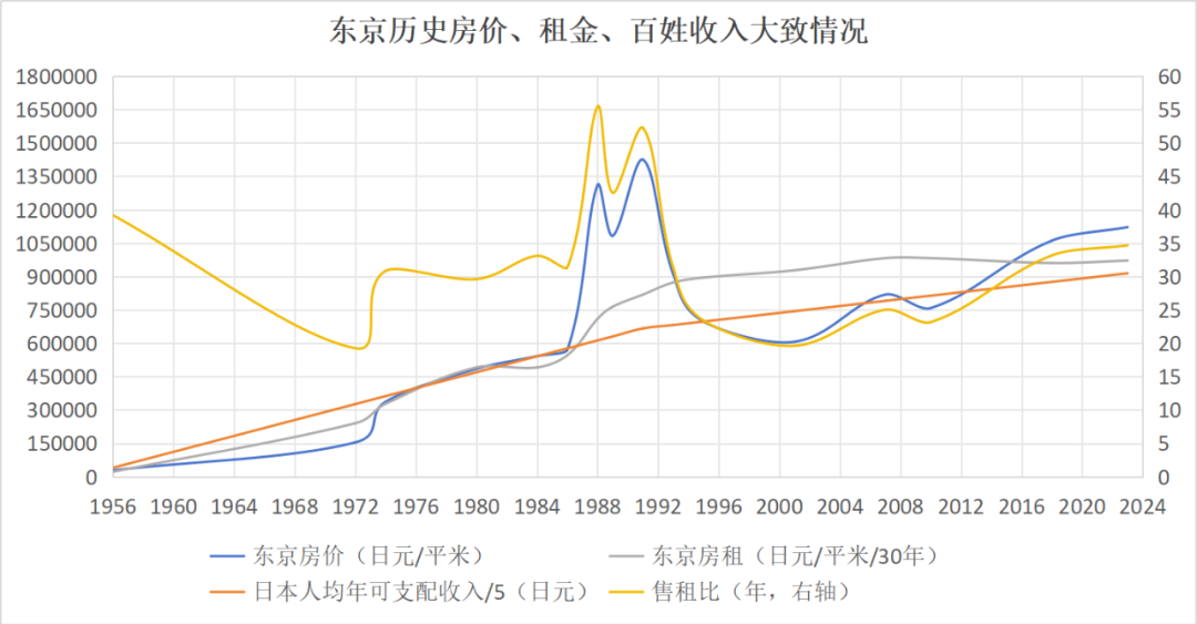 我们都知道日本1990年也出现过房价泡沫,于是我搜集了日本东京历史上历年的房价、租金、日本百姓收入情况,尝试作图。